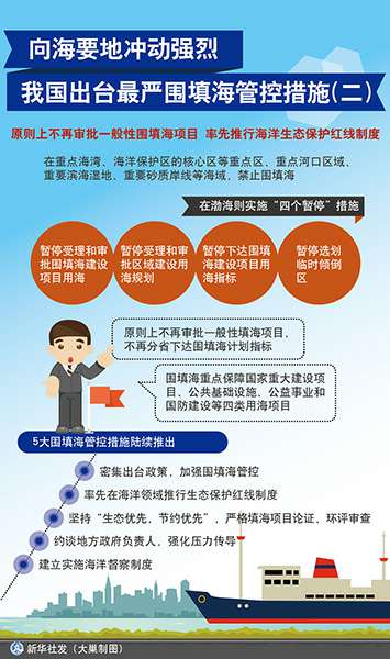 17日,国家海洋局举行围填海情况新闻发布会,国家海洋局副局长林山青宣布,结合围填海督察整改工作,国家海洋局将采取“史上最严围填海管控措施”,以期保护优先、集约利用的用海理念牢固确立,使海域开发利用得到可持续发展。